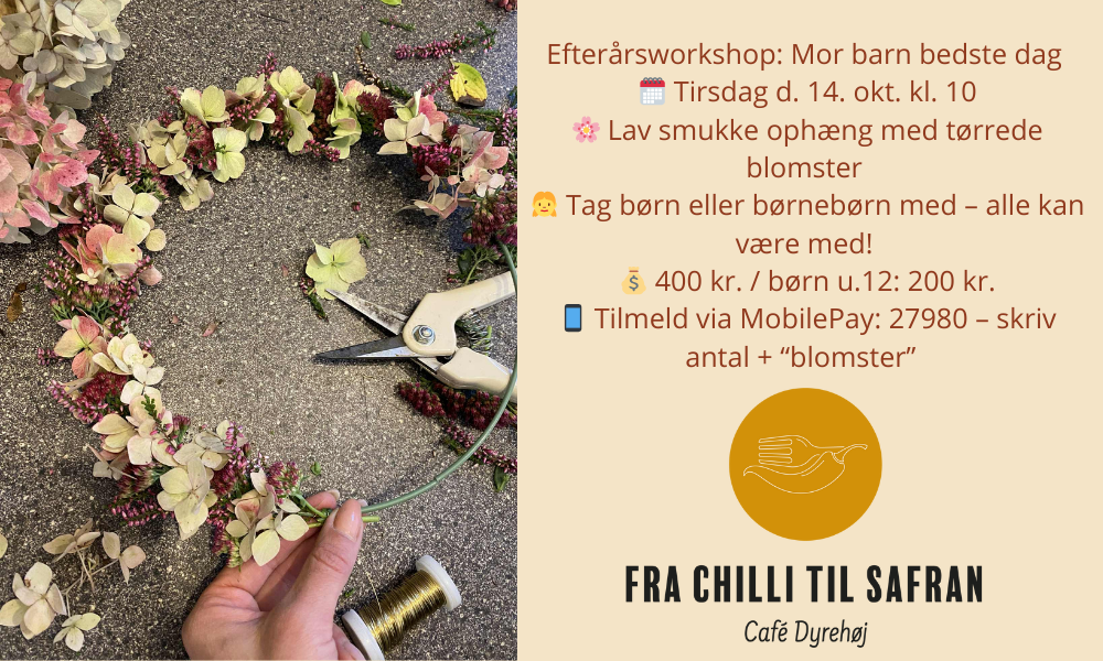 Tag dit barn eller barnebarn med til en hyggelig formiddag i efterårsferien, hvor vi sammen laver fine og holdbare ophæng. Vi arbejder med smukke tørrede blomster og naturmaterialer, som bliver til små unikke pynteting – perfekte til at hænge op i vinduet eller lægge som stemningsfuld dekoration på et fad.